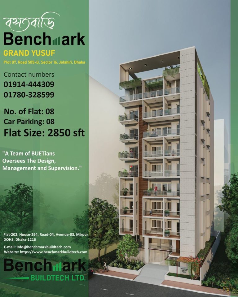 BenchMark GRAND YUSUF, offers your dream home with all aspiration in a fascinating location, which is an upcoming nerve center of Dhaka city. This aspiring location serves all the demands of a residential space with a range of educational institutes, banks, hospital, mosques, shopping centers, restaurants and many other service oriented ventures in the surrounding neighborhood. Create your best ever home in style and comfort with BenchMark BuildTech Ltd.